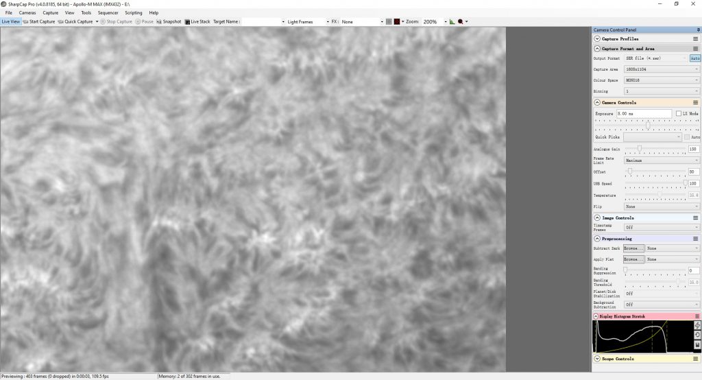 The brightness of the central and edge regions of the sun will be much different, so if you are in pursuit of perfection, you can adjust the exposure time appropriately (it is recommended not to move the gain), keep the maximum value of the histogram is about 70%. Or we trying to save time, we can shoot all areas with one exposure and then lighten or darken them later.