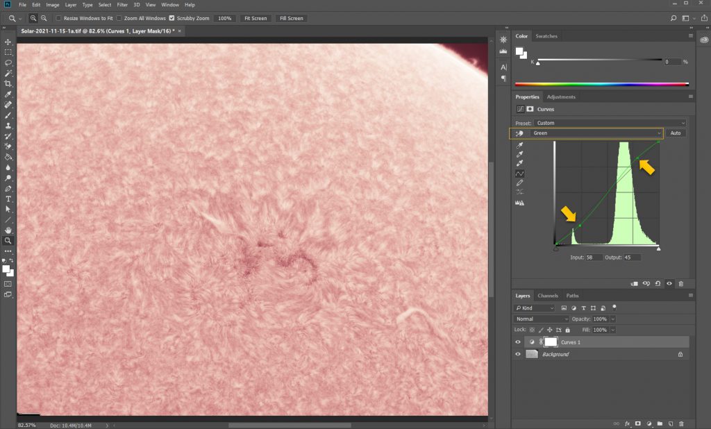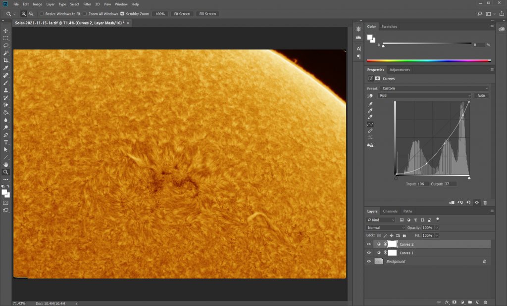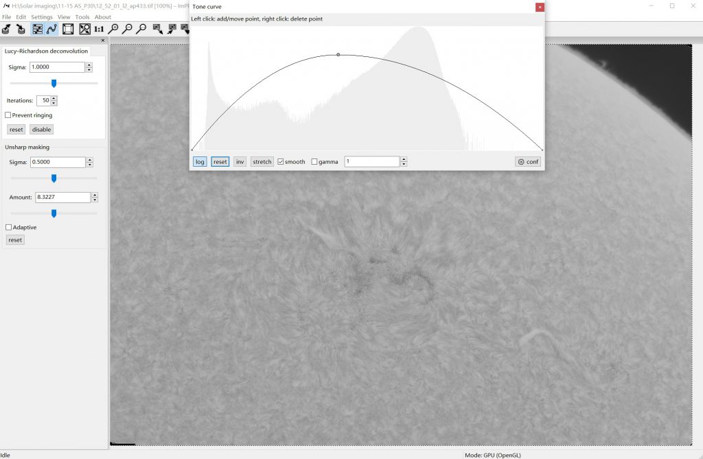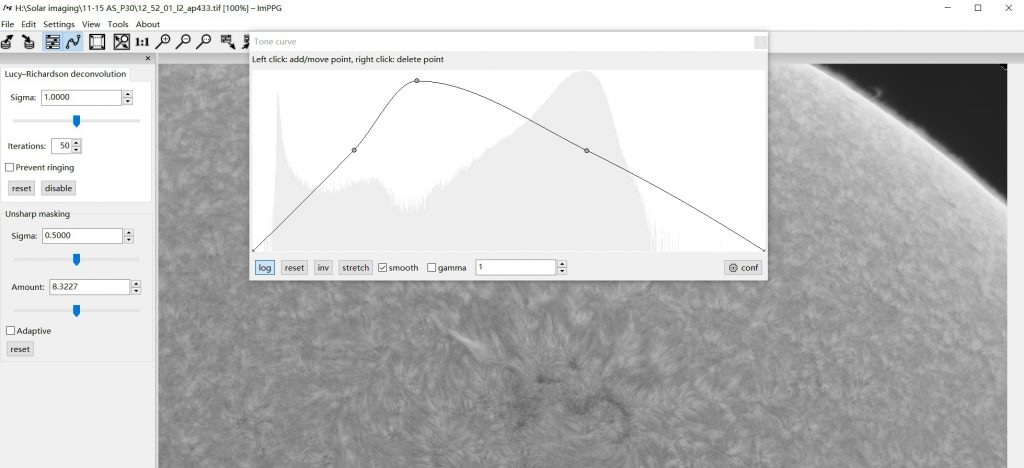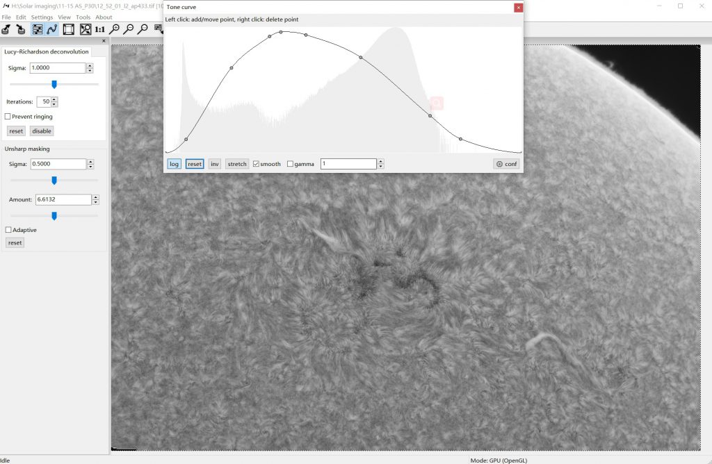 2) Sharpening parameters are based on the seeing. If the seeing is good, set Sigma to 0.5 and turn up Amount to 2-10, it will be very delicate and clear. If seeing is poor, set Sigma to 1 and turn up Amount to 2-20 as needed to have enough detail.