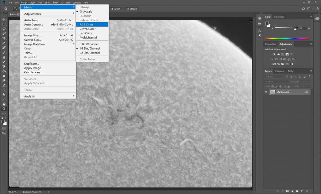 In photoshop, we needs to do is add color and contrast of the image to enhance the aesthetic of the image. The first thing to do is change the mode of the image from grayscale to RGB so that color can be added.